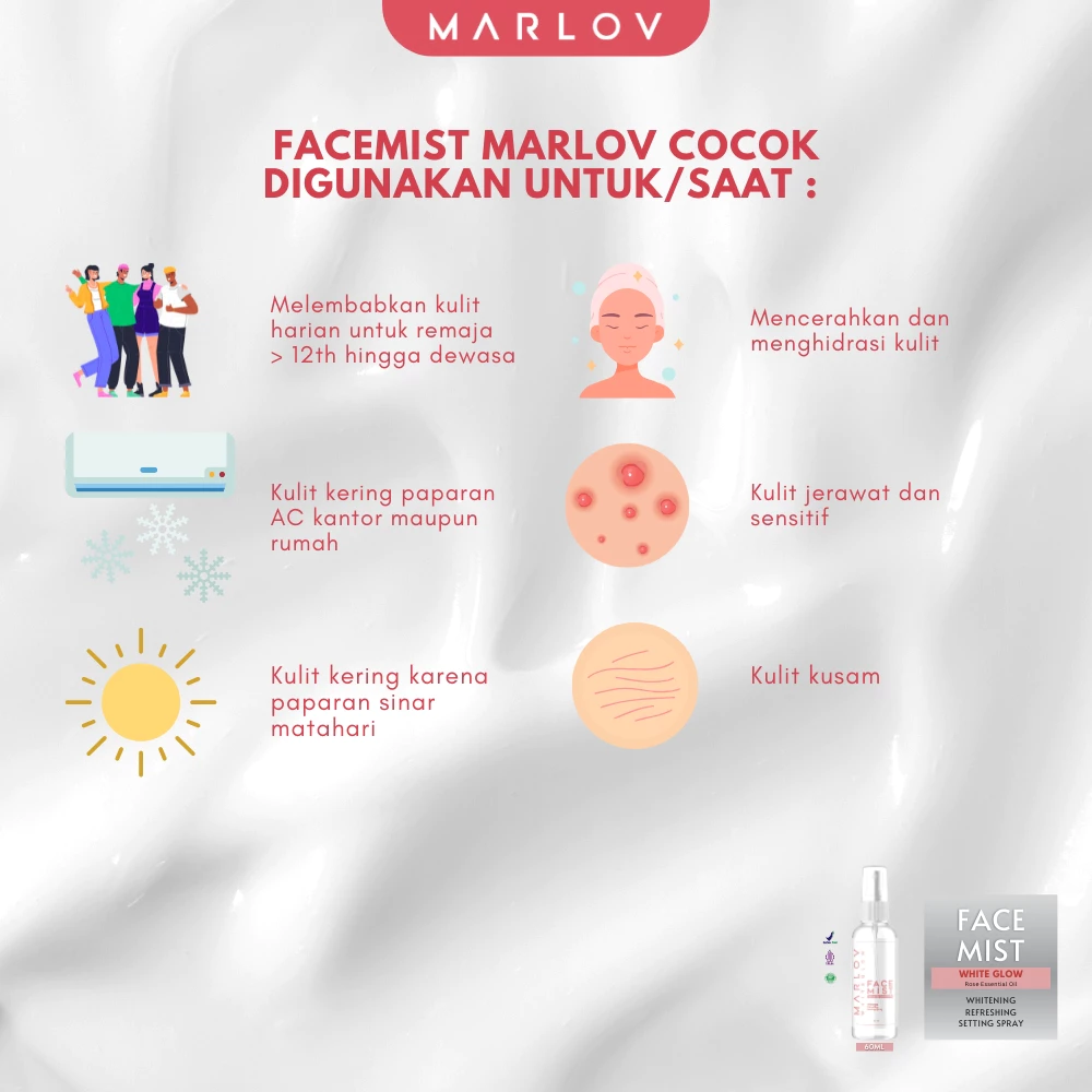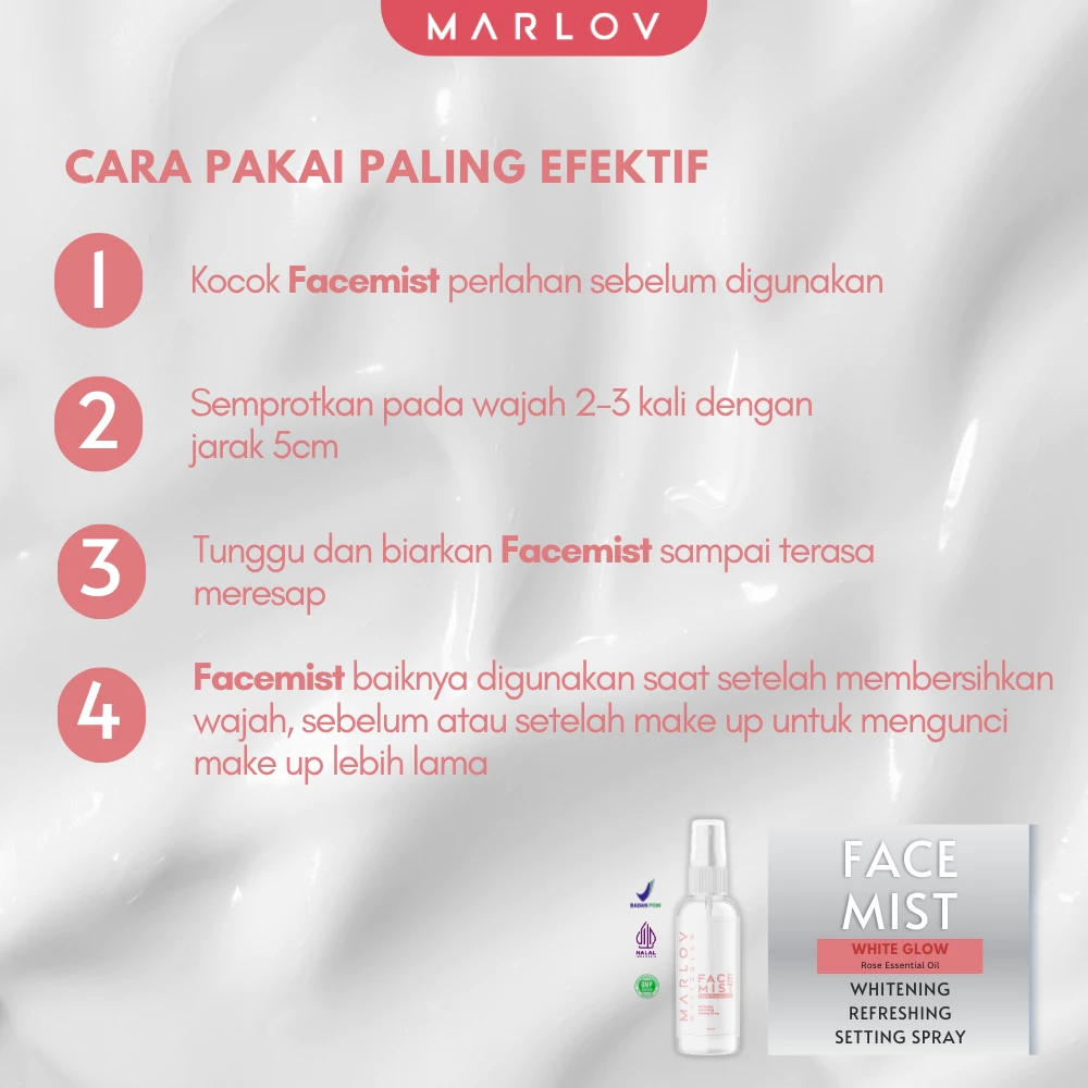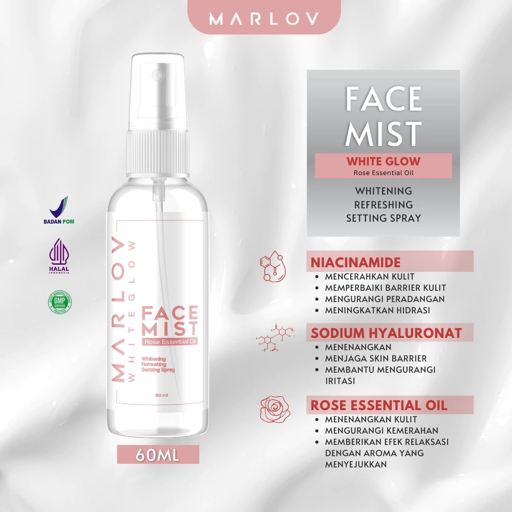 Marlov White Glow Face Mist adalah penyegar wajah multifungsi yang diformulasikan untuk mencerahkan, menyegarkan dan mengunci makeup sekaligus. Menggunakan fine Mist Spray yang menghasilkan butiran halus seperti embun untuk memastikan produk tersebar merata.